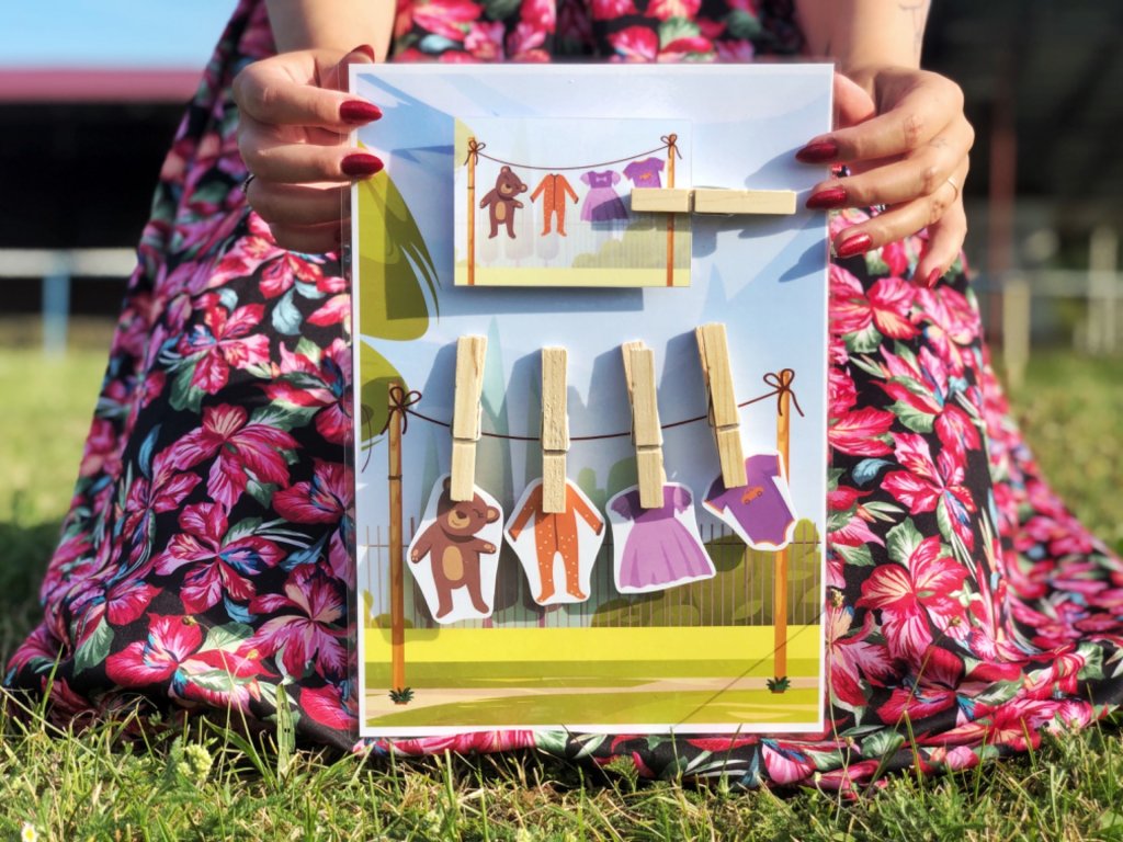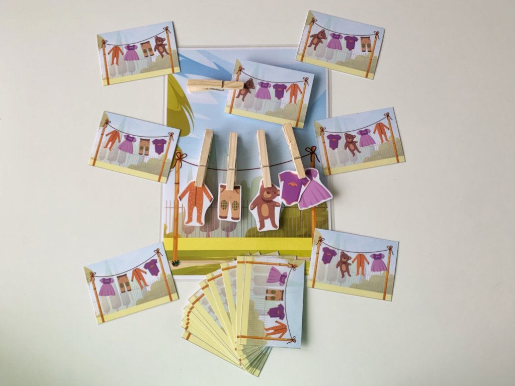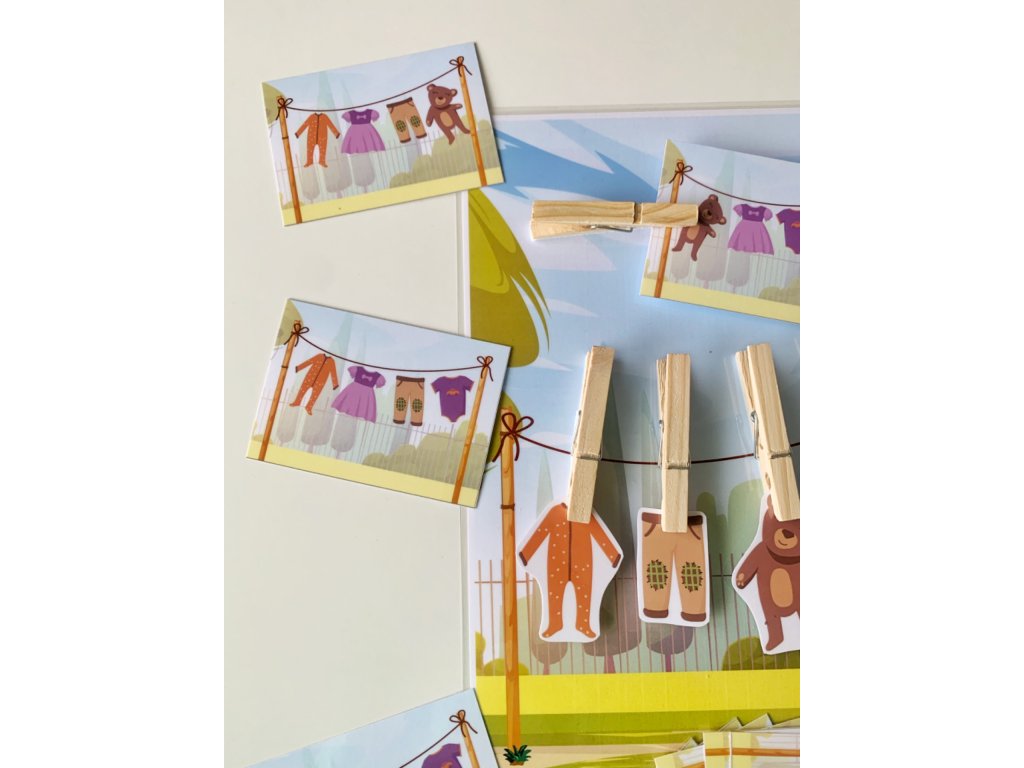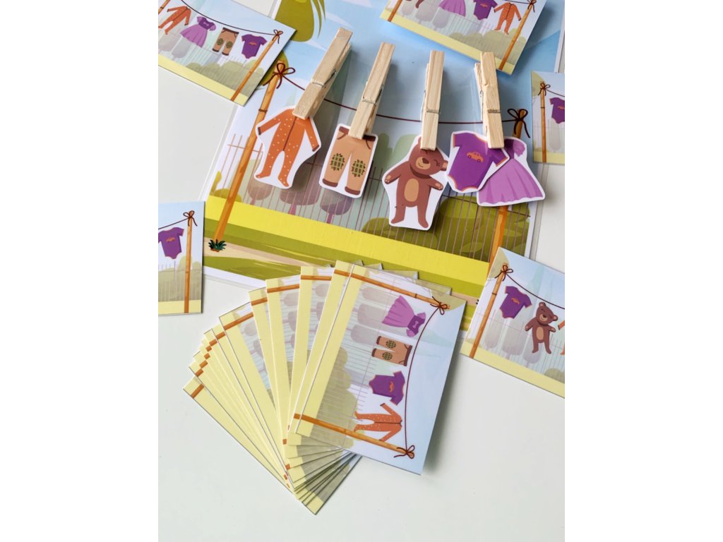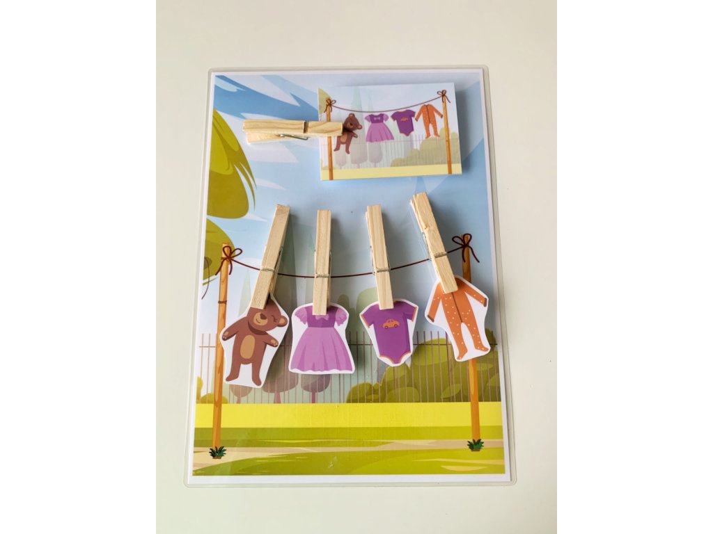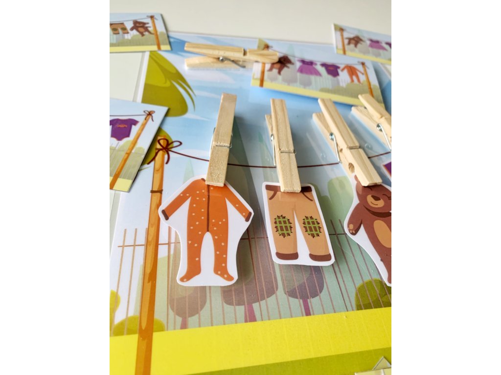 Táto štipcová hra obsahuje stranu so šnúrou na prádlo a 5 ks oblečenia. Vďaka 20tim rôznym kartičkám si môžu deti skladať prádlo podľa predlohy. Na šnúre je miesto pre 4ks oblečenia a jeden štipec slúži na uchytenie šablóny. Deti si precvičia pamäť a vďaka štipcom aj jemnú motoriku.