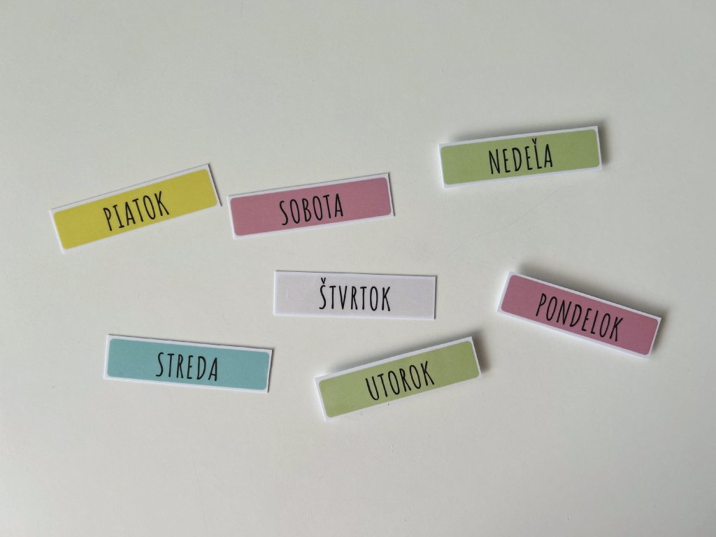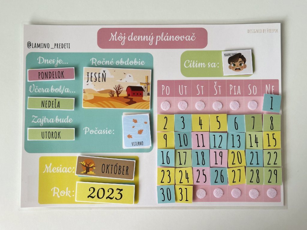 Denný plánovač dostanete už kompletne hotový, laminovaný s nastrihanými potrebnými dielikmi, pre spoznávanie dní, mesiacov, ročných období, či počasia. Dodávame s praktickým magnetom a možnosťou prichytenia na chladničku.