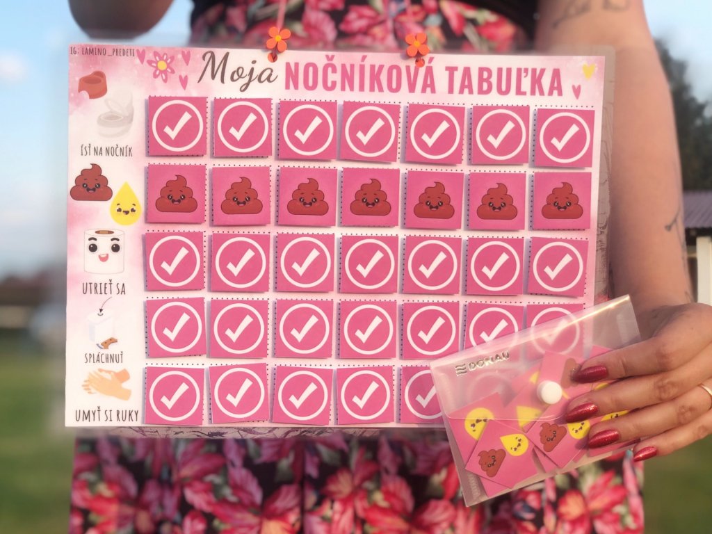 Dieťatko si do nej môže nalepiť obrázky a zaznačiť si činnosti, ktoré splnilo. Verzia v ružovom a modrom prevedení. Je tam dostatok obrázkov na vyplňovanie, ktoré sú zabalené v obálke, aby sa nepostrácali. Samozrejmosťou je aj šnúrka na zavesenie/alebo sa dá tabuľka upevniť magnetom napr. na chladničku. Formát A4.