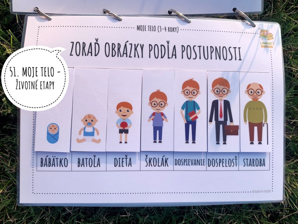 Témy pracovných listov: ňživotné etapy, časti tela, časti tváre, poskladaj tvár, pomenuj prsty na rukách, pomenuj časti tela, orgány, systémy tela, chute, zdravá/nezdravá strava, zdravé/pokazené zúbky, emócie, zmysly.