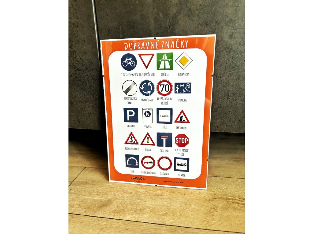 Vzdelávací plagát na tému DOPRAVNÉ ZNAČKY. Obsahuje 20 základných dopravných značiek. Tento plagát je vhodný do detskej izby či do školy.