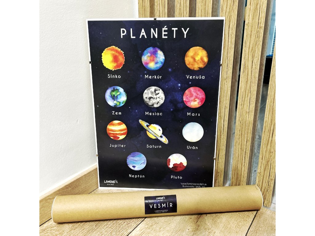 Tento vzdelávací plagát na tému VESMÍR (planéty) je vhodný do detských izieb či školských tried. Obsahuje autorské obrázky planét (a samozrejme aj náš Mesiac). Pod každou planétou je aj jej názov.