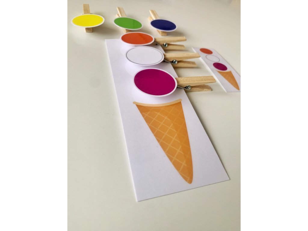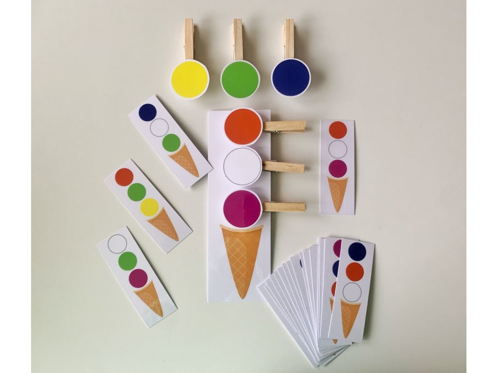 Štipcová hra obsahuje kornútok, na ktorom je miesto pre tri kopčeky zmrzliny. 20 kartičiek zaručí zábavu a zaženie nudu. V tejto hre je 6 rôznych farieb. Deti si precvičia pamäť, farby a vďaka štipcom aj jemnú motoriku.